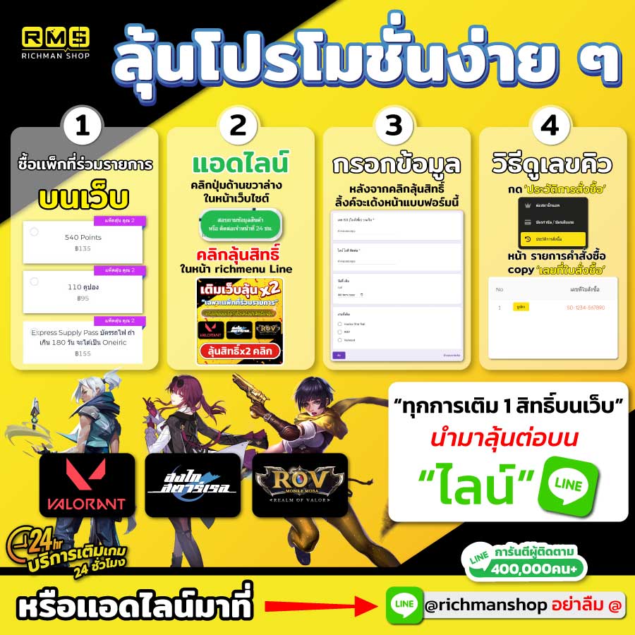 เมื่อทำการซื้อแพ็กที่ร่วมรายการเสร็จ ลูกค้าจะได้เลข SO ซึ่งอยู่ในรายการคำสั่งซื้อ หลังจากนั้น ลูกค้าเพียงเพิ่มเพื่อนทาง Line Official : @richmanshop ต้องมี@ นำหน้า หรือ คลิก เพิ่มเพื่อน ได้เช่นกัน (ของแท้ผู้ติดตามมากกว่า 450,XXXคน) เมื่อเข้ามาถึง ลูกค้าจะเจอเมนู ที่เด้งขึ้นมา เลือกที่ ICON “เติมเว็บลุ้นX2”