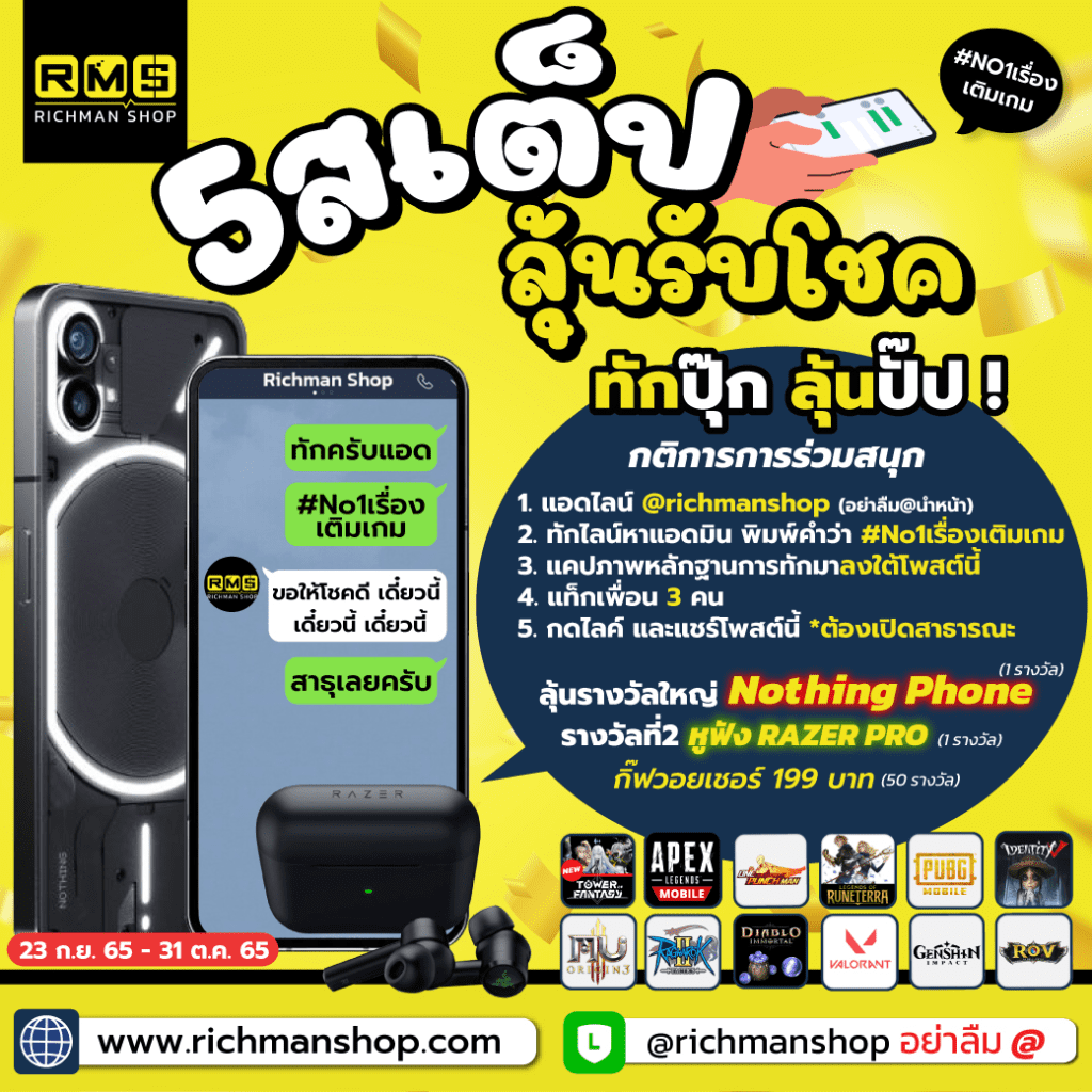 Richman Shop ใจป๋า แจกใหญ่ใส่เต็มกับมือถือNothing Phone ตัวTop มือถือแฟชั่นสุดจี๊ดเท่ไม่ซ้ำใคร มาพร้อมไฟหลังกระพริบวิบวับ และ Spec ที่เล่นได้ทุกเกมแบบสุด! 2 รางวัล รางวัลละ 20,900 บาท!