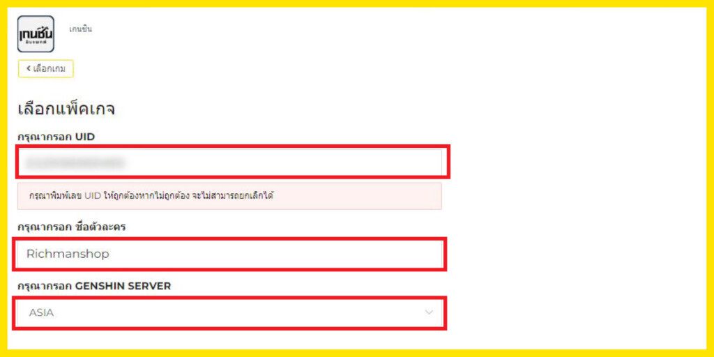 6.จากนั้น ให้ทำการกรอบข้อมูล UID ข้อมูลของเกมหรือ DI ที่ต้องเติมให้เรียบร้อย