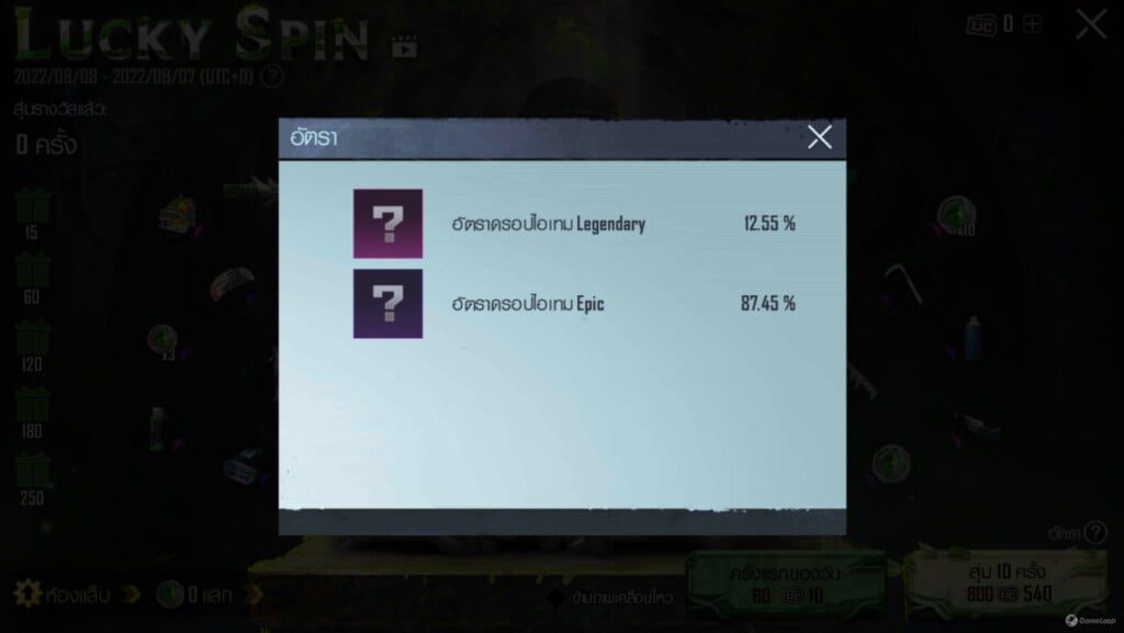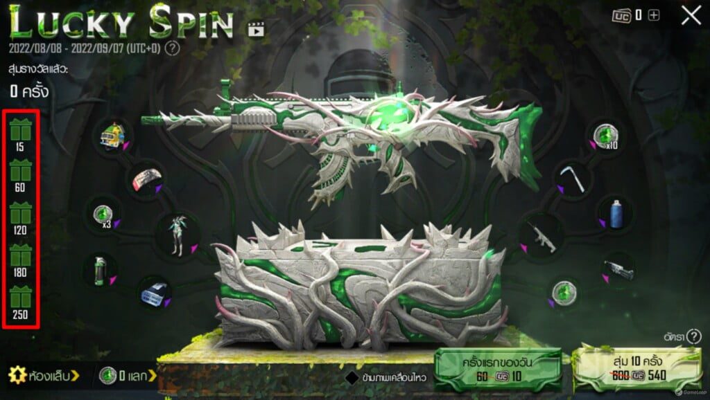หากใครที่คิดว่าแต้มบุญไม่ถึงแน่ๆ ไม่ต้องห่วง การสุ่มมีโควต้าให้อยู่ที่ 250 ครั้งจะการันตีเหรียญนำไปแลกสกิน THORN OF MALICE – SCAR-L ที่ใช้ 450 เหรียญได้ทันที