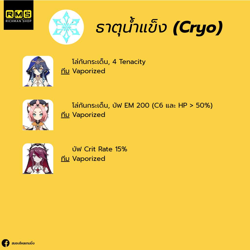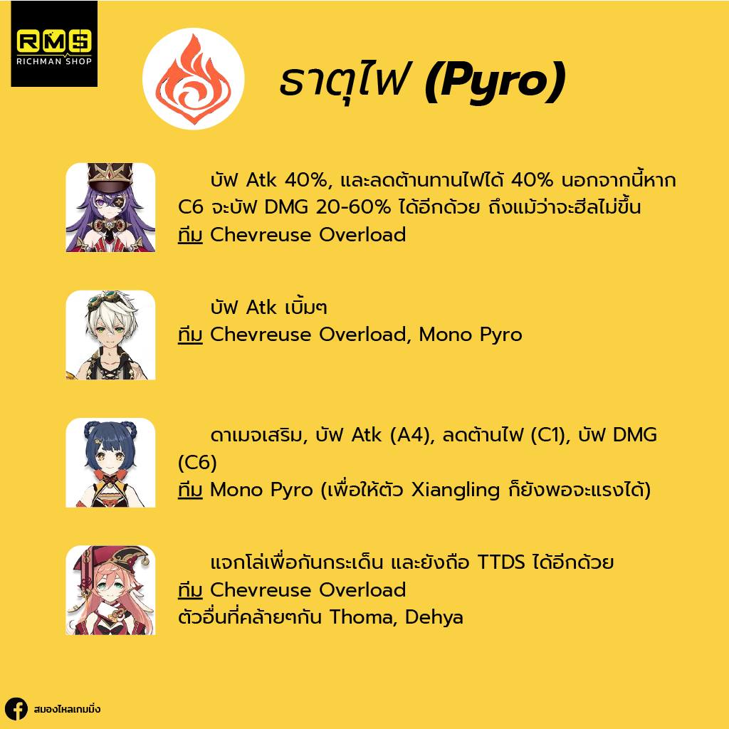 ทีมนี้จะประกอบไปด้วย Chev ที่รับบทลดต้านทานธาตุ, บัฟ Atk 40% และบัฟ DMG ~40% ถ้ามีถึง C6, Beidou มารับบทบัฟกันกระเด็น 50% และลดดาเมจ 35% จากท่าไม้ตาย ส่วนช่องสุดท้ายก็จะเป็น Flex สักตัวจากธาตุไฟฟ้า หรือ ไฟ
