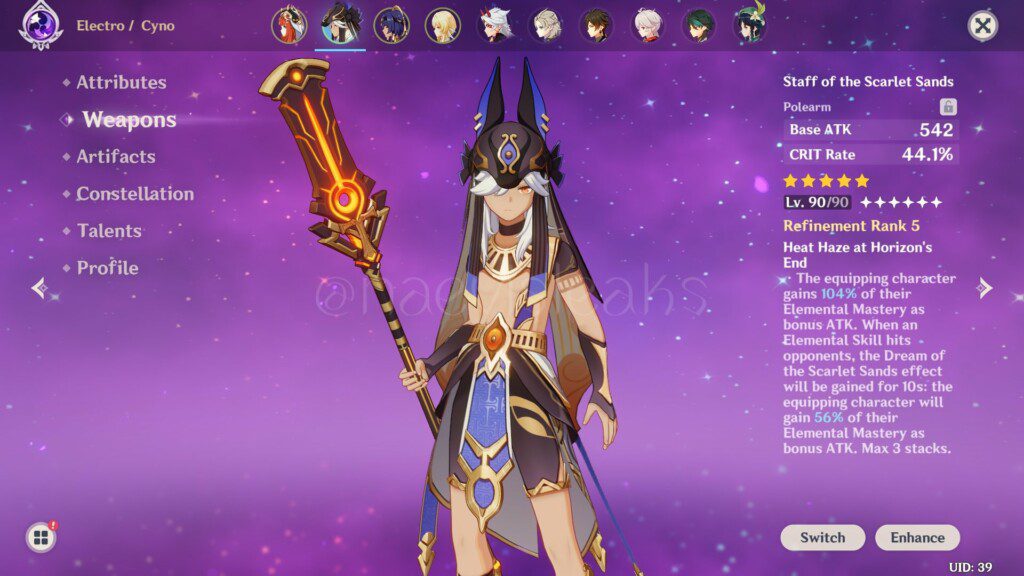 2. เมื่อ Cyno อยู่ในสาวะ Pactsworn Pathclearer ของ Sacred Rite: Wolf’s Swiftness(สกิลท่าไม้ตาย) จะเข้าสู่สภาวะ Endseer เป็นระยะๆ ซึ่งเมื่อใช้ Sacred Rite: Chasmic Soulfarer(สกิลธาตุ) ในสภาวะดังกล่าว จะทำให้เกิดเอฟเฟกต์ ‘Judication’ จะทำให้การโจมตีของสกิลธาตุ ในครั้งนี้สร้างเสียหายเพิ่มขึ้น 35% และปลดปล่อย Duststalker Bolt ออกไปข้างหน้า 3 อัน และทำให้เกิดความเสียหายธาตุไฟฟ้าเพิ่มขึ้น 50% ตามพลังโจมตีของ Cyno