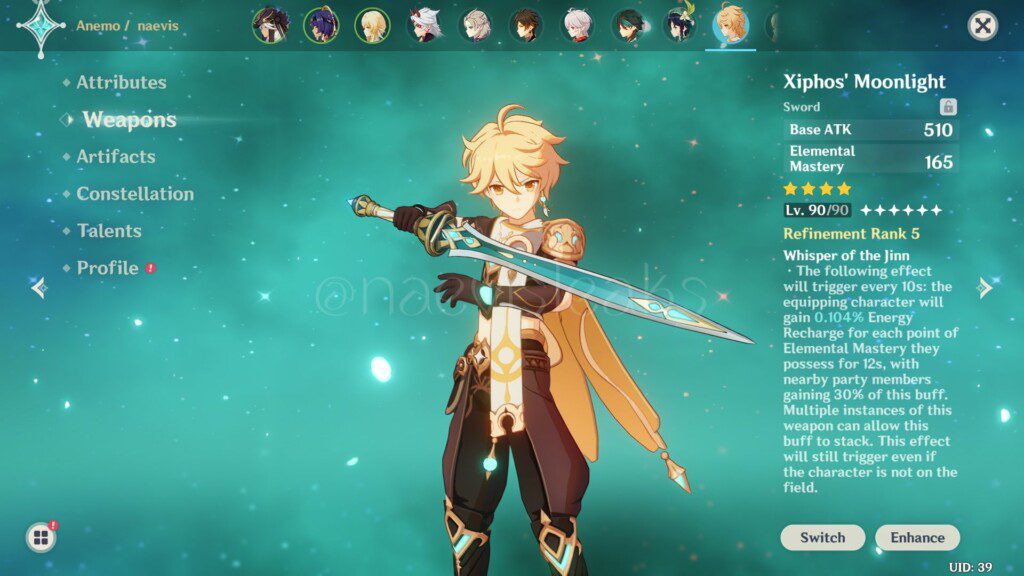 ความสามารถ : ในทุก 10 วินาที จะเกิดเอฟเฟกต์-ความชำนาญธาตุแต่ละหน่วยของตัวละคร จะประสิทธิภาพการฟื้นฟูพลังงานธาตุให้แก่ตัวละคร 0.052%(0.065%/0.078%/0.091%/0.104%) เป็นเวลา 12 วินาที และ ตัวละครอื่นที่อยู่ในทีมจะได้รับประสิทธิภาพการฟื้นฟูพลังงานธาตุเพิ่ม 30% ของเอฟเฟกต์นี้ ซึ่งเอฟเฟกต์นี้จากอาวุธชนิดอื่นสามารถซ้อนทับกันได้ แม้ไม่ได้เข้าร่วมต่อสู้