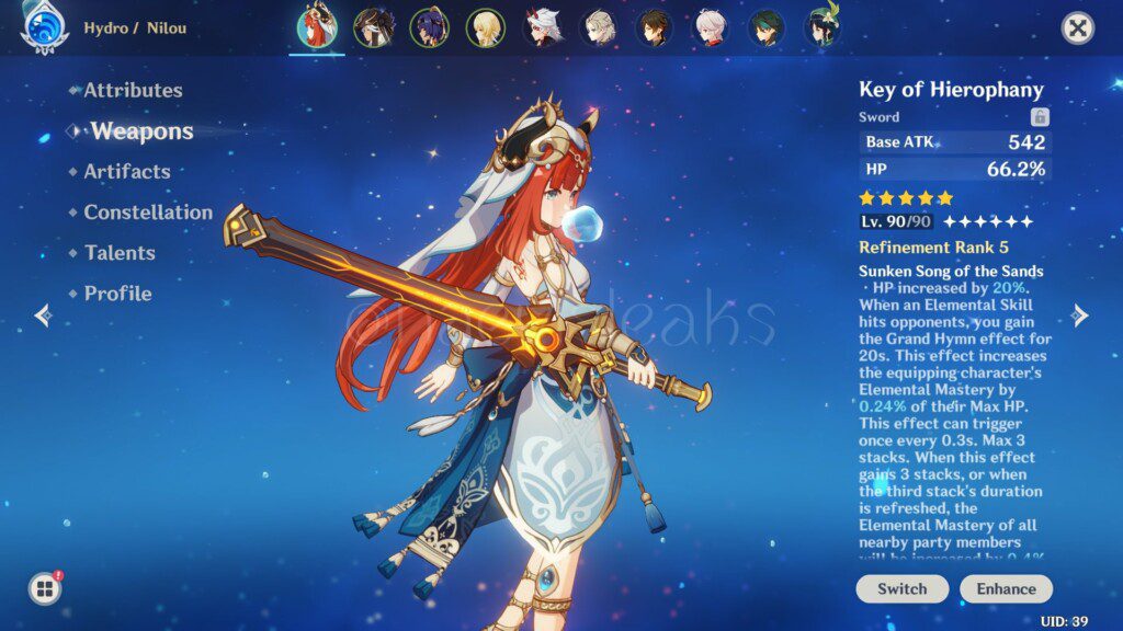 Lv.6 Frostbreaker’s Melody – ทุก 1,000 หน่วยขอองค่าพลังชีวิตสูงสุด จะทำให้อัตราคริของ Nilou เพิ่ม 0.6% และ ความแรงคริเพิ่ม 1.2% (อัตราขึ้นจะเพิ่มได้มากสุด 30% และ ความแรงคริเพิ่มได้มากสุด 60%)