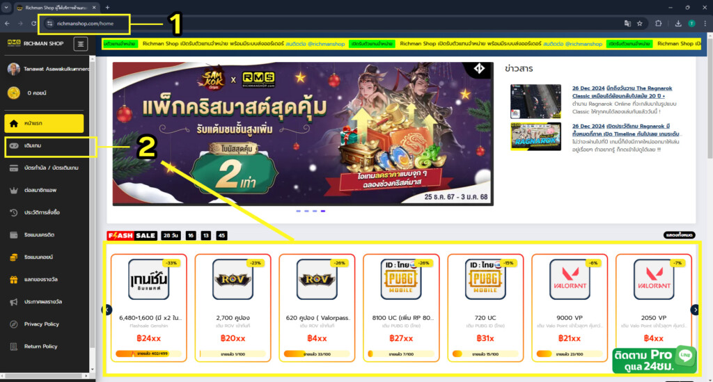 ขั้นแรก เข้าไปที่เว็ปไซต์ที่ทุกคนคุ้นตาอย่าง richmanshop.com จากนั้นเลือกเกมที่เกมเมอร์อยากเติมจากหน้าแรกของเว็ปไซต์เรา หรือไปที่แถบด้านซ้ายที่มีคำว่า “เติมเกม” เพื่อดูเกมทั้งหมดที่เราสามารถเติมได้ โดยเรามีเกมให้เลือกเติมกว่า 80 เกม!