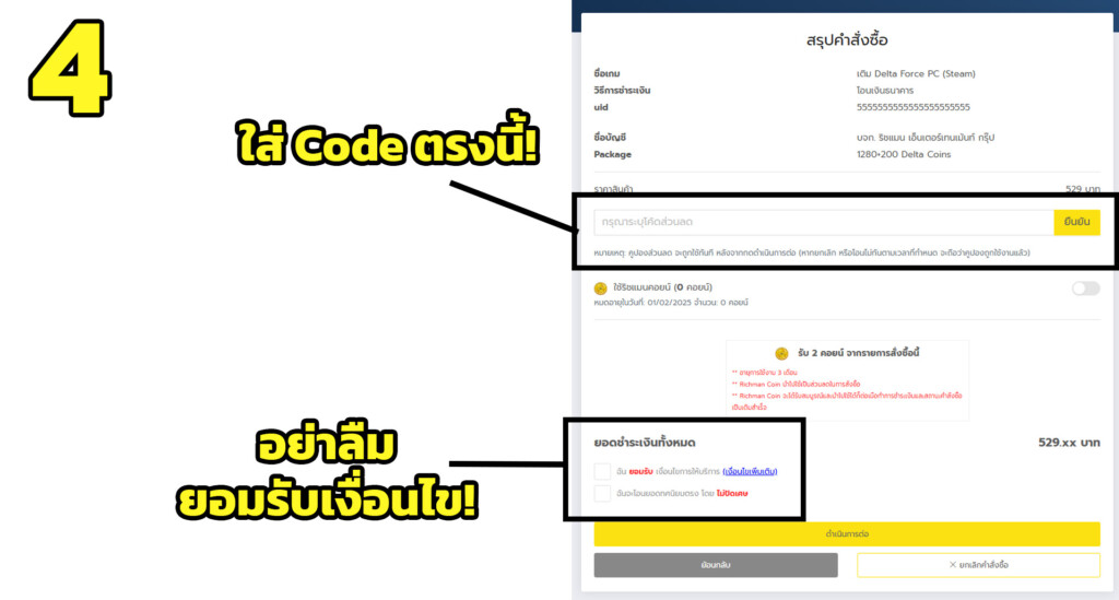 กดเสร็จแล้วจะนำเกมเมอร์ทุกท่านมาที่หน้าสรุปคำสั่งซื้อโดยในย่อหน้าแรกจะเป็นสรุปราคาและแพ็คที่เกมเมอร์ได้เติมไปเมื่อครู่นี้ และในย่อหน้าต่อมาจะเป็นช่องกรอก Code ส่วนลดของเรานั้นเอง! ให้เกมเมอร์กรอก Code ที่ได้มาลงไป จะ Copy + Paste ก็ได้ หรือพิมพ์ Code ให้ถูกต้องก็ได้นะ เมื่อเสร็จแล้วให้ยอมรับเงื่อนไขต่าง ๆ เพื่อไปหน้าชำระเงิน