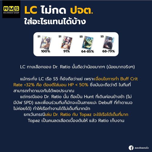 จากการคำนวนดาเมจโดยเฉลี่ย (Average Damage) LC ปจต. ของ Ratio นั้นแรงกว่า LC ฟรีๆอย่าง SU ซ้อน 5 ถึง ~15% ซึ่งดาเมจของ LC SU นี้เป็นแบบ Buff Up เต็มแล้วคือมี Crit Rate +32% และ Atk +40%