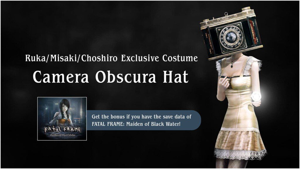 และหากคุณเคยเล่น FATAL FRAME: Maiden of Black Water พร้อมมีเซฟเกมอยู่ในเครื่องก็จะได้โบนัสเป็นหมวกหัวกล้องของตัวละคร รูกะ , มิซากิ และ โชจิโระ อีกด้วย ถ้าพรีออเดอร์เกมก่อนวันที่ 9 มีนาคมจะมีแถมหน้ากากจิ้งจอกและหมวกไฟฉายหินวิญญาณแบบ Limited สำหรับ 3 ตัวละครไปเลย