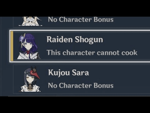 ขุ่นแม่ Raiden Shogun ของเรานั่นเอง! ซึ่งก็เป็นหนึ่งในเรื่องกลุ้มใจของขุ่นแม่ดังที่เธอกล่าวว่า “อย่าให้ฉันทำอาหารเลยนะ ฉันทำได้หมดทุกอย่างเลยล่ะ ยกเว้นเรื่องทำอาหารน่ะ” แม้ว่าจะไปอยู่หน้าการปรุงอาหารแล้ว แต่พอจะกดเลือกตัวละครสำหรับการปรุงอาหาร เมื่อเลื่อนมาถึงขุ่นแม่ Raiden Shogun ก็จะขึ้นว่าตัวละครนี้ ไม่สามารถทำอาหารได้ ดังนั้นก็อย่าไปบังคับขุ่นแม่ให้เธอกลุ้มใจเลยนะ ตัวละครอื่นมีให้เลือกอีกเยอะแยะ