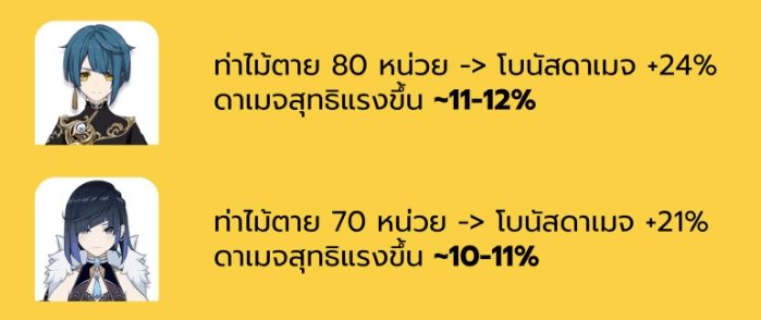 ซึ่งในกรณีนี้ Xinggiu และ Yelen ทั้ง 2 ตัวจะได้รับผลจากสกิลธาตุของ Raiden ทำให้ท่าไม้ตายมีโบนัสความเสียหายมากขึ้น