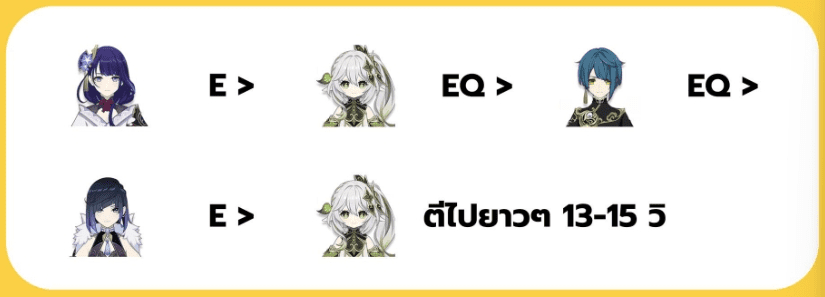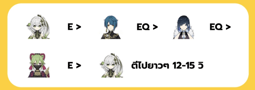 ทำให้เวลาเราใช้ Shinobu นั้น เราต้องเป๊ะมาก คือเซ็ตทุกอย่างให้เสร็จก่อน แล้วค่อยมากดสกิลธาตุ Shinobu จากนั้นไปจบที่ Nahida ยืนสนามตี (ดูได้จากหน้า Ratation ก่อนหน้านี้)