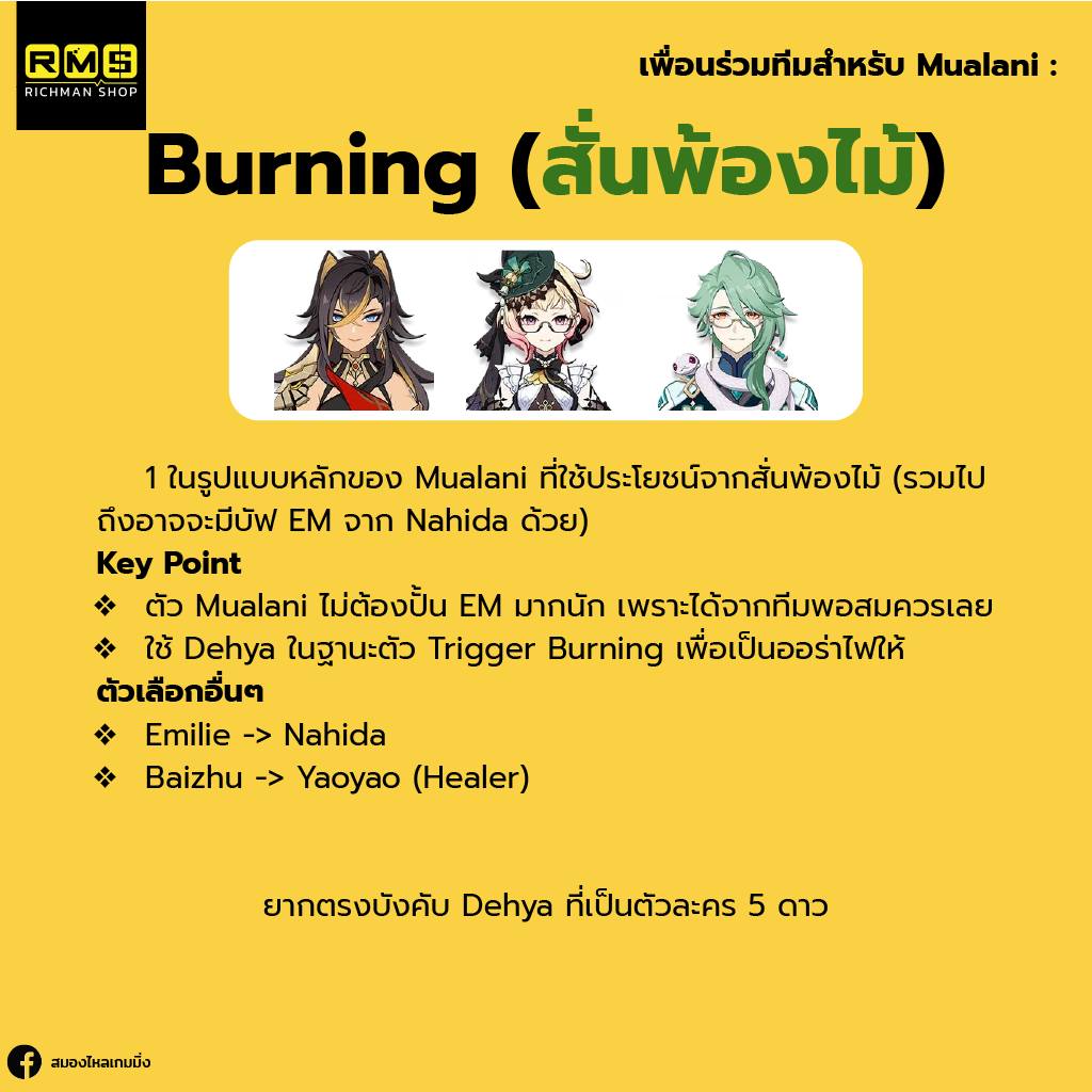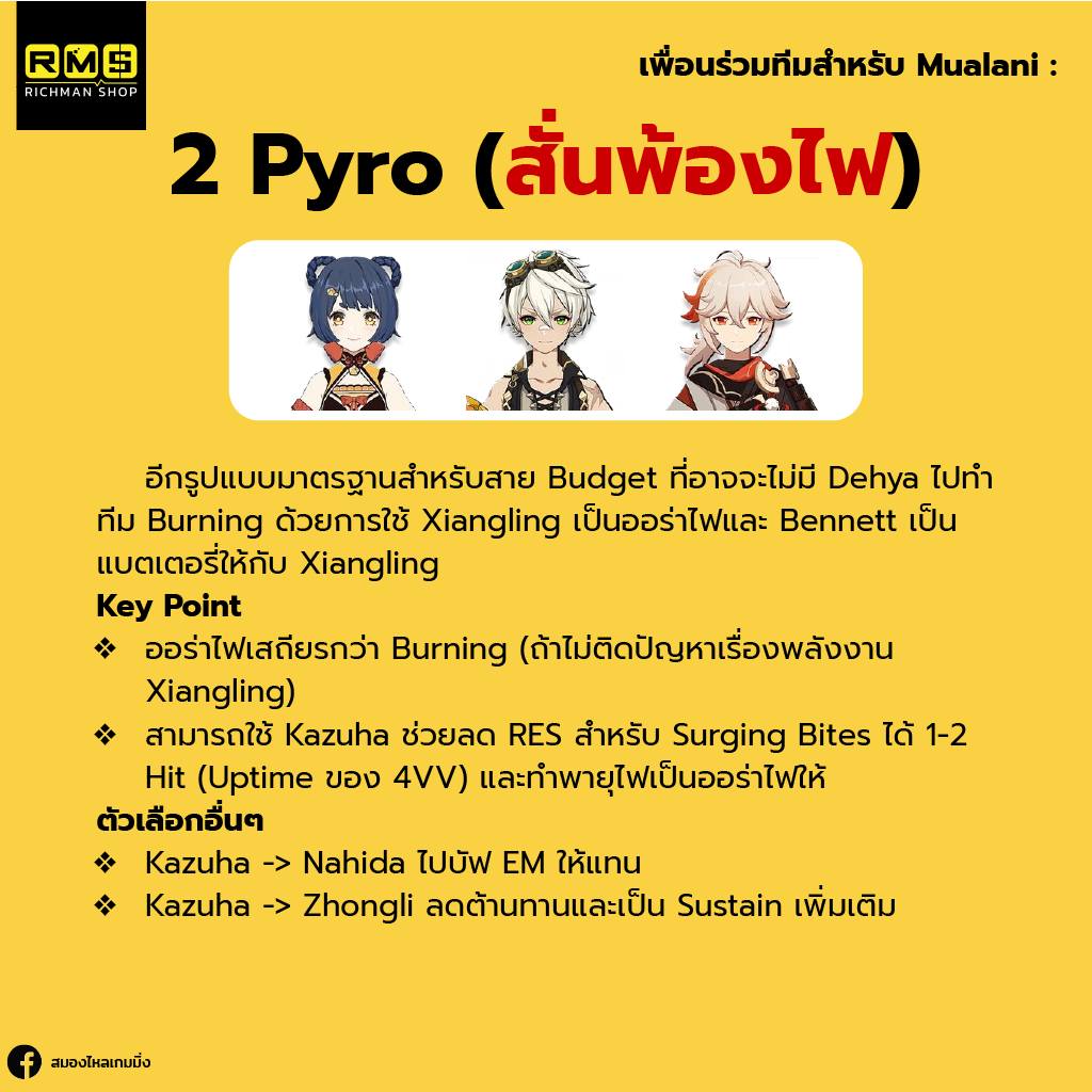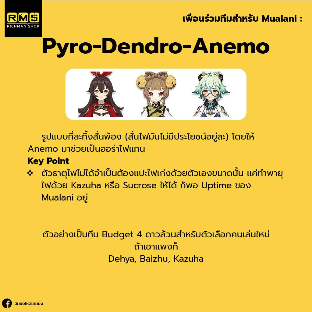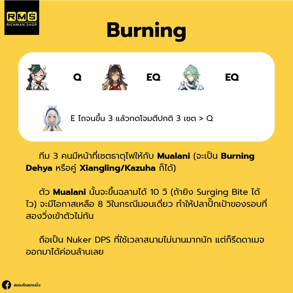 ทีมของ Mualani รูปแบบค่อนข้าง Fixed มากๆ เพราะทั้ง Kit ของตัวละครและอาวุธประจำ ตัว บ่งบอกมาก ว่าต้องเล่นระเหยเท่านั้น แถมเป็นระเหยธาตุน้ำด้วย ที่ต้องมีออร่าไฟที่แข็งมาก ตัวเลือกทีมจึงเป็น
