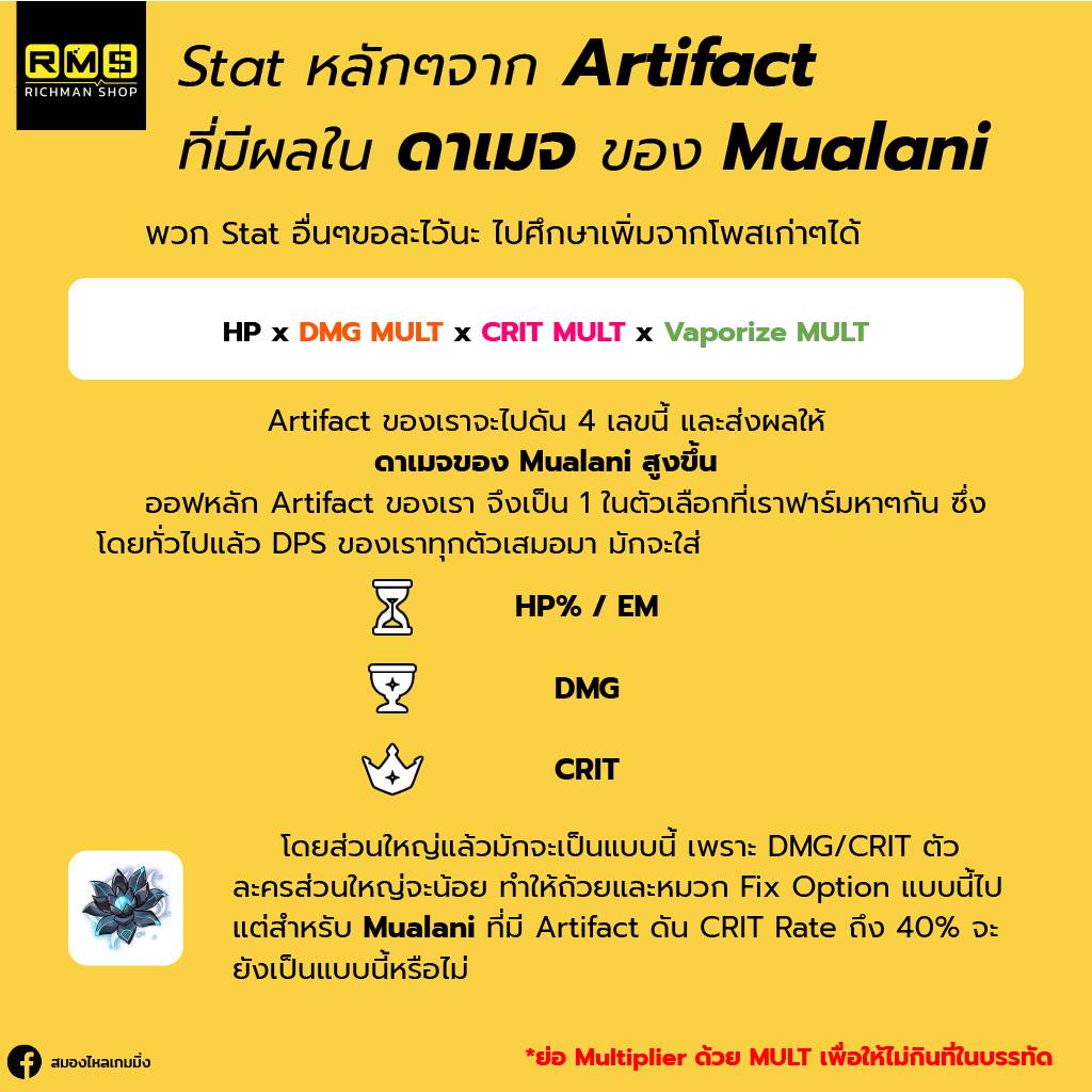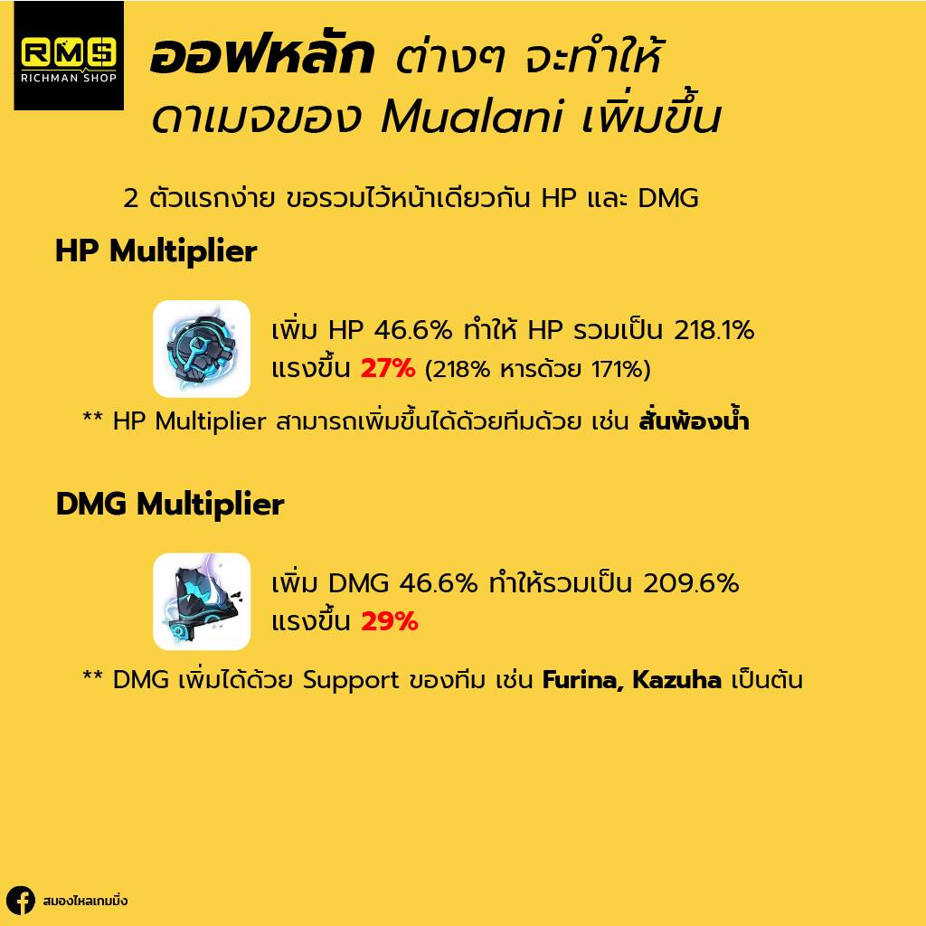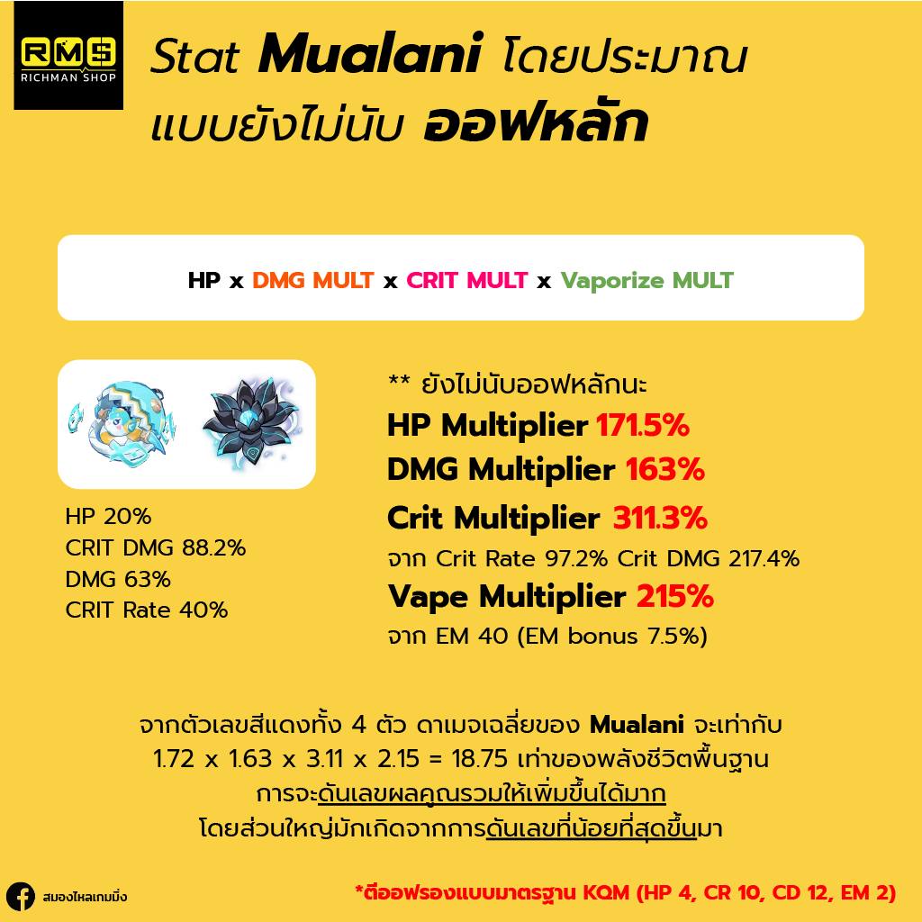 Hypercarry ทั่วไปแล้ว ก็มักจะ wombo combo Bennett, Kazuha, Zhongli จบๆ บัฟ Atk, DMG เยอะๆ แล้วก็ฟาดเลขใหญ่ๆ แต่สำหรับ Mualani แล้ว ดันหิวชำนาญธาตุอีกเลขด้วย เพื่อที่จะทำดาเมจระเหยให้รุนแรง