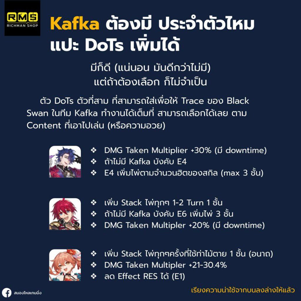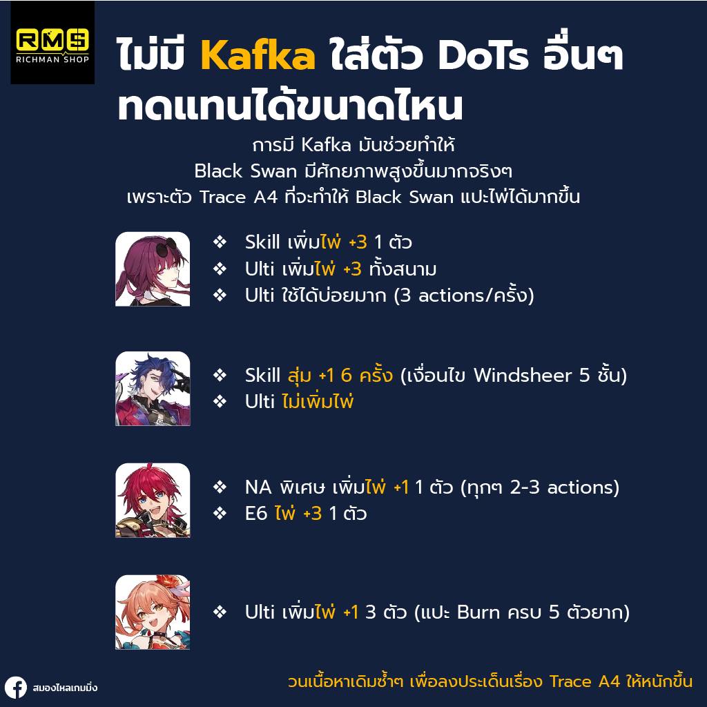สามารถลด DEF ให้กับ DoTs ต่างๆ ได้สูงสุดๆถึง 87.6% (ปจต.) นั่นคือหาก Kafka เราสามารถช็อตได้ทีละ 10000 การมี Black Swan จะช็อตได้ถึง 18800 เลย (แอคชั่นแต่ละแบบลด DEF ได้ไม่เท่ากันนะ)