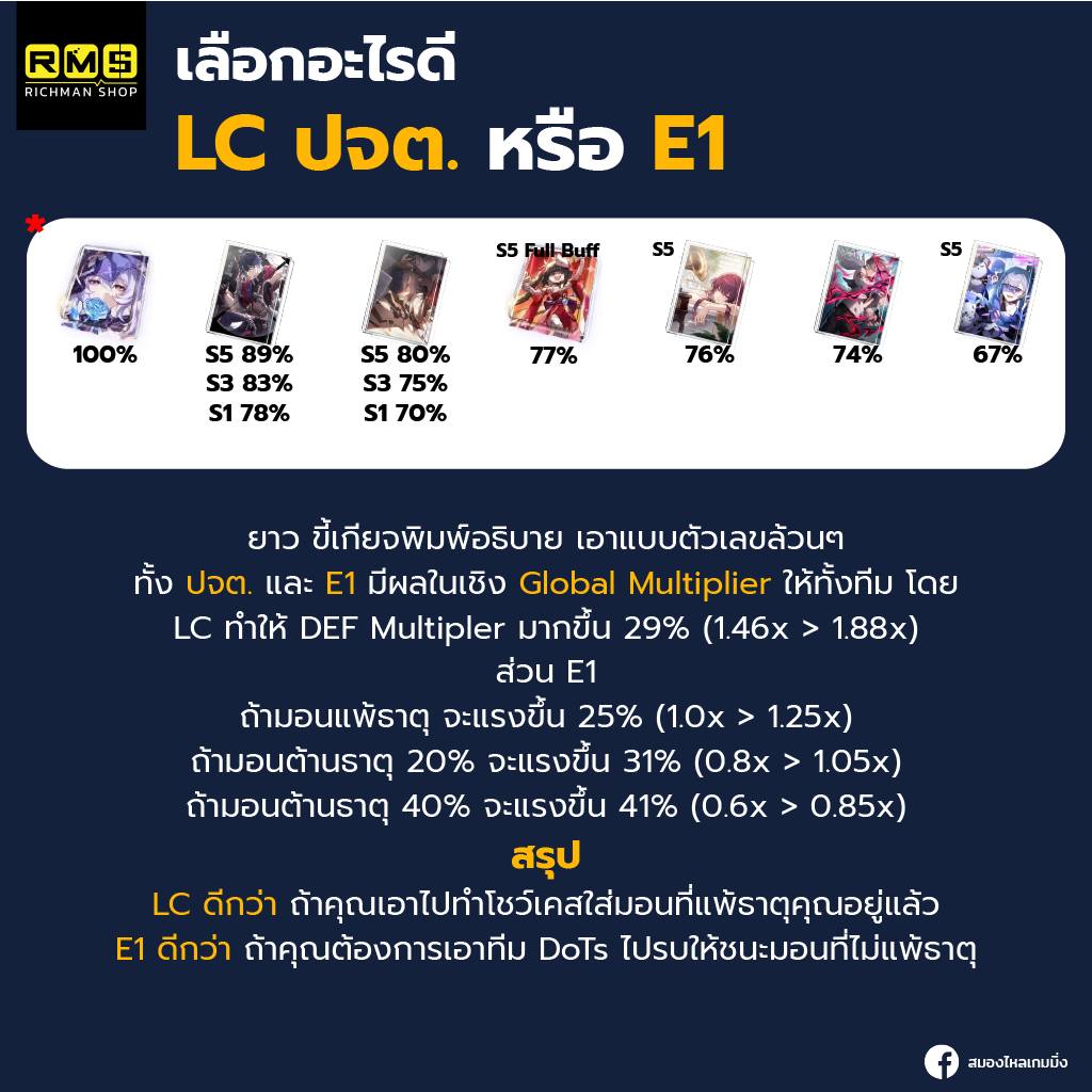 รอกด LC MoC เซตต่อไปที่กำลังจะเข้ามาพร้อมกันได้เลย ได้ทั้ง DMG%, Atk% ถือว่าดีที่สุดรองลงมาจากพวก LC ที่ต้องพึ่งพากาชาพวกนั้นละPersonal DMG นั้นจะอยู่ที่ 77% เมื่อเทียบกับ ปจต. แต่ตัว Team DMG ก็ไม่ได้ด้อยลงไปจาก Sampo 4*, Pela 4* มากนัก ยังไงดาเมจของทีม Black Swan + Kafka หลักๆ มันมาจากการที่ -DEF ไปทำให้ดาเมจ Kafka เพิ่มมากขึ้นซะมากกว่าเยอะ