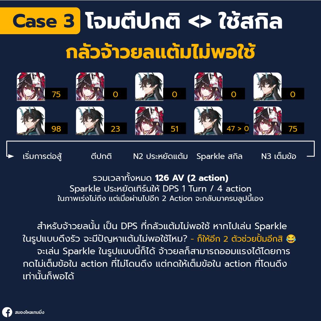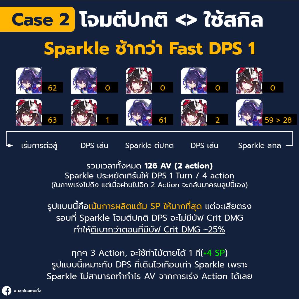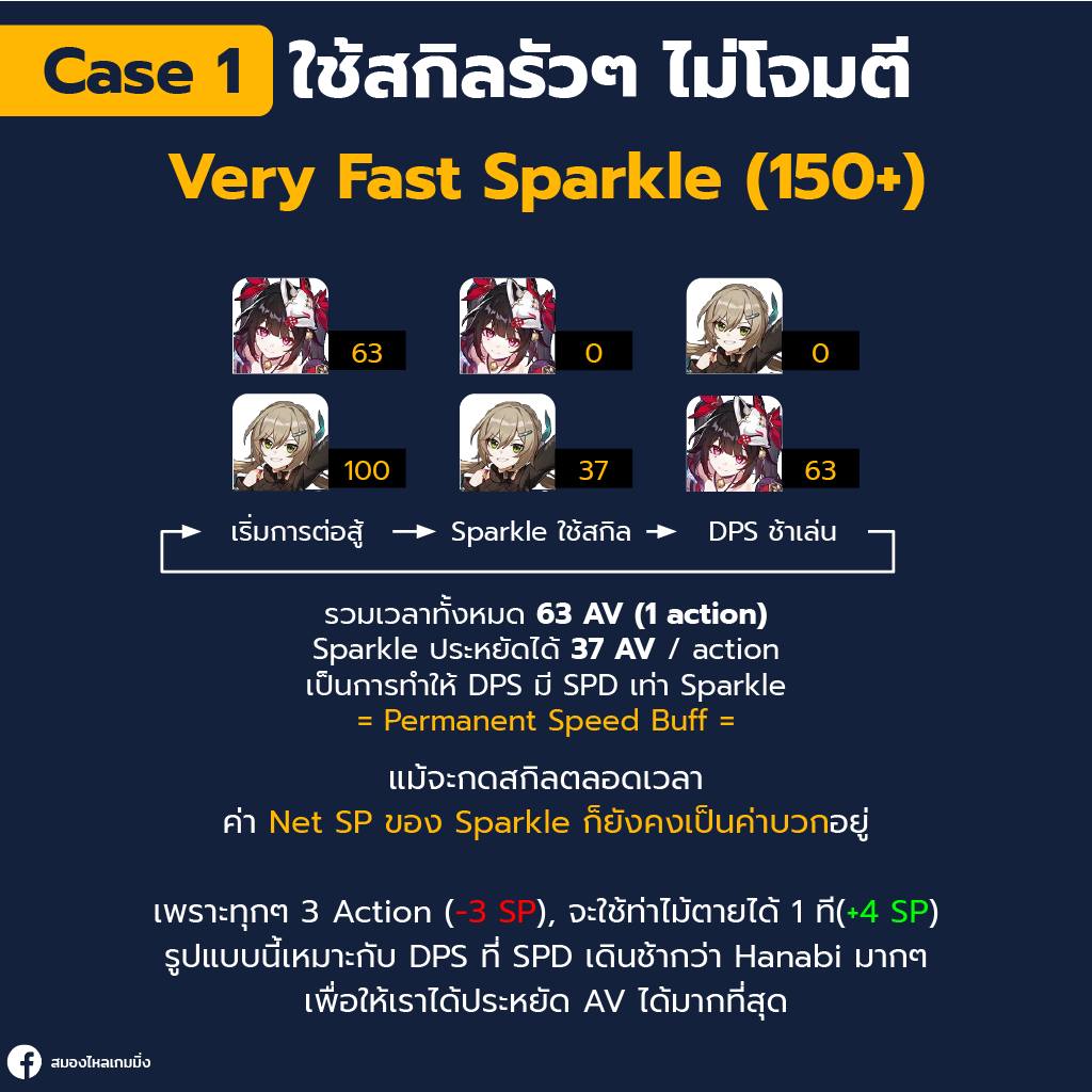 หลายคนอาจแย้ง บัฟ Crit มันอยู่แค่ Turn เดียว จะเอาบัฟตลอดเวลาก็ต้องกดสกิลตลอด มันจะไม่เปลืองแต้ม?สำหรับ Sparkle นั้นแม้จะกดสกิลตลอดเวลา ค่า Net SP ของ Sparkle ก็ยังคงเป็นค่าบวกอยู่