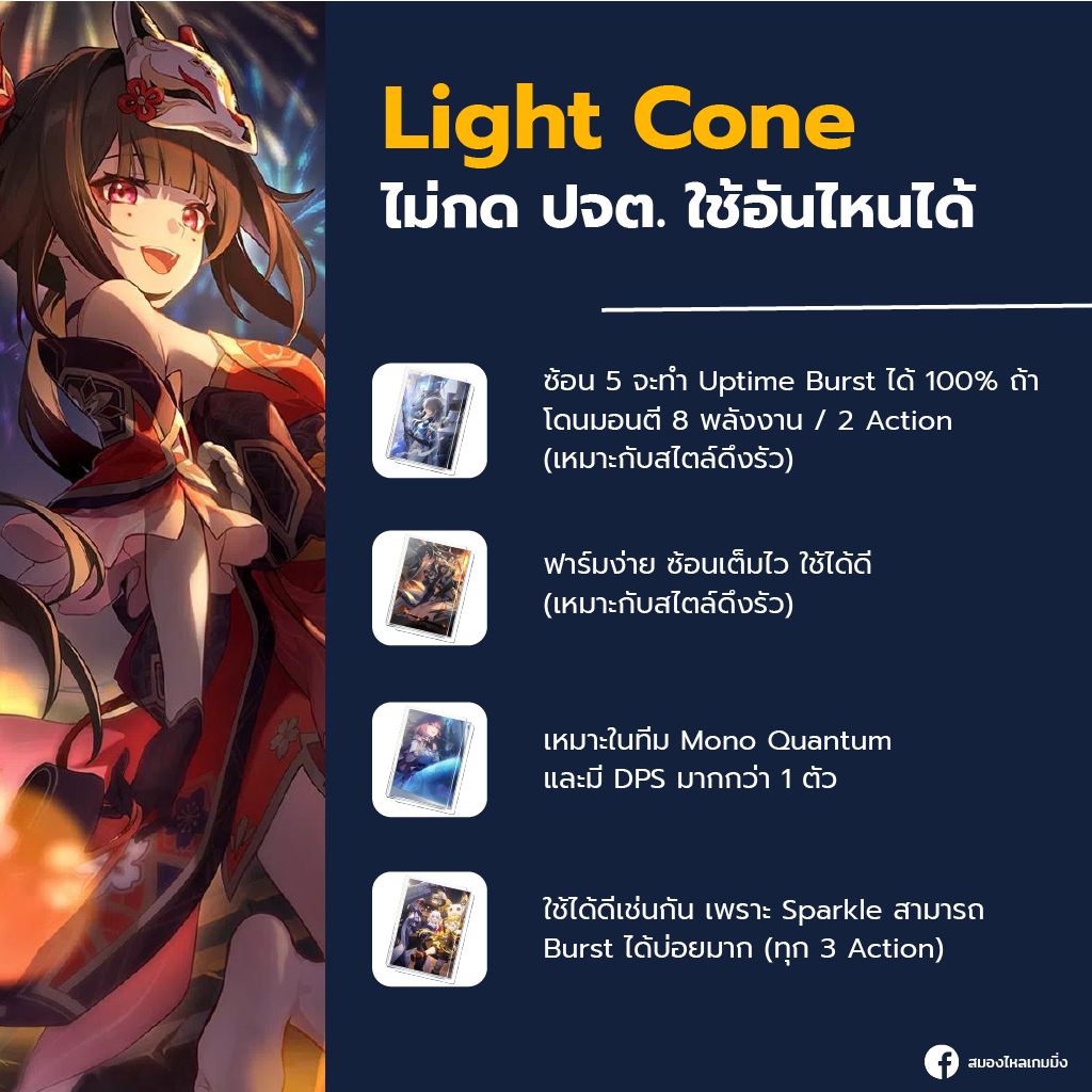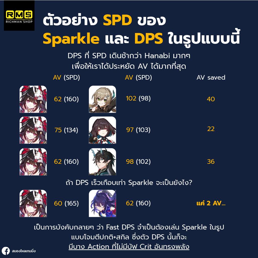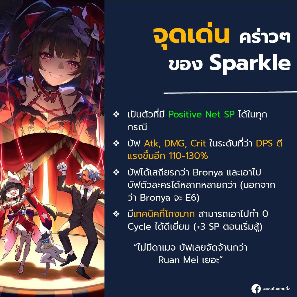 เพราะ Sparkle นั้นอัด Stat ให้กับ DPS สูงในทั้ง 3 แกน atk 15-45%, DMG 48%, และ Crit DMG เกือบ 100% ทำให้ Multiplier ของ DPS เมื่อคูณกันออกมาแล้ว ทำให้ตีแรงขึ้นอีกเป็นเท่าตัวเลย