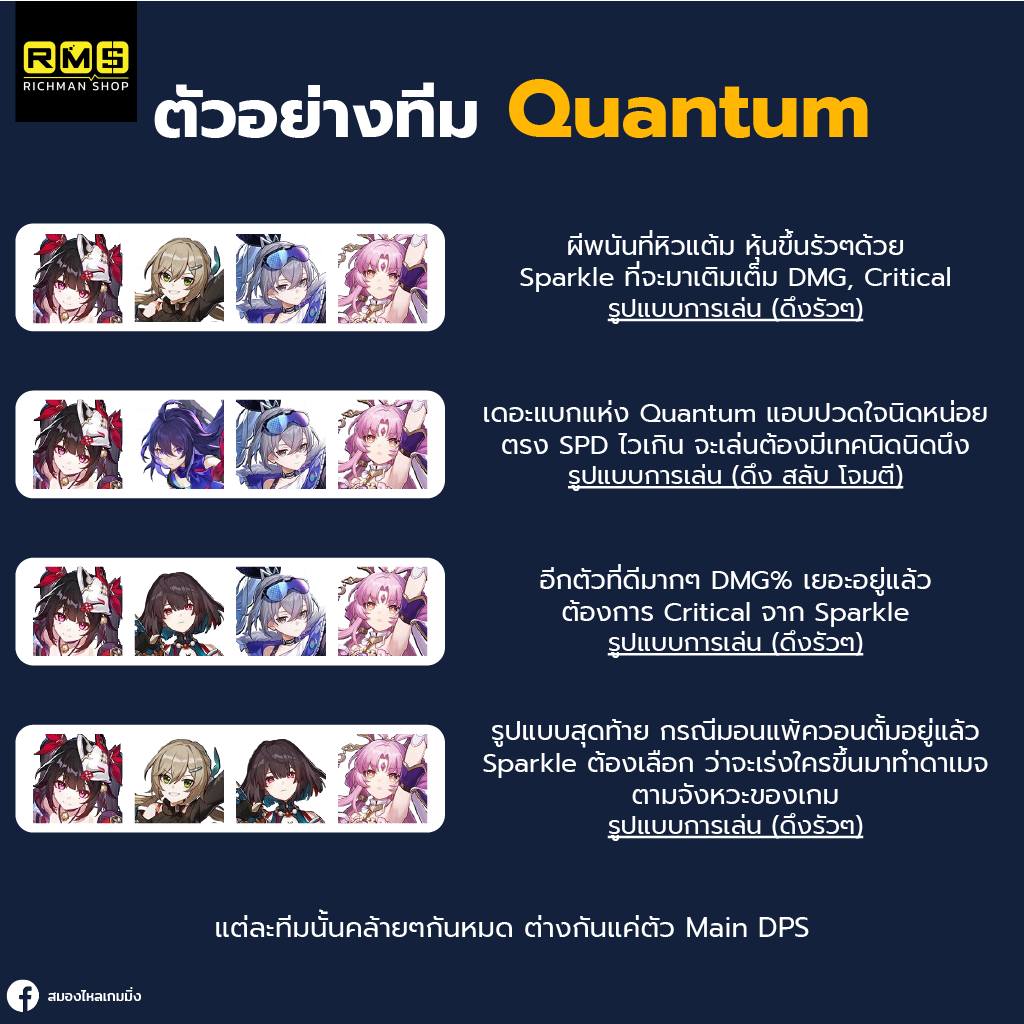 เอาไปเล่นกับทีมที่ไม่ใช่ควอนตั้ม ก็ถือว่าดีมากๆอยู่ การที่ทีมเป็น Mono Quantum นั้น ทำให้ประสิทธิภาพการบัฟนั้นเพิ่มขึ้นอีก ~10% เท่านั้นเอง