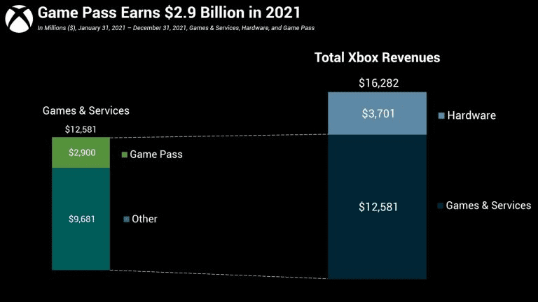 ตามรายงาน Xbox Game Pass มีรายได้ 2.9 พันล้านดอลลาร์ตลอดปี 2021 โดยรายได้จากเกมและบริการทั้งหมดของ Xbox สำหรับปีนี้อยู่ที่กว่า 9.6 พันล้านดอลลาร์ และรายรับทั้งหมด (ซึ่งรวมถึงยอดขายฮาร์ดแวร์ด้วย) อยู่ที่ 16.2 พันล้านดอลลาร์ . ซึ่งหมายความว่าในปี 2021 รายได้จากการเล่นเกมทั้งหมดของ Microsoft ประมาณ 18% และรายได้รวมของ Xbox ประมาณ 30% นั้นมาจาก Game Pass บัญชีทั้งหมดนี้มีเฉพาะรายได้บนคอนโซลเท่านั้น ดังนั้นจึงไม่รวมรายได้จาก Game Pass บนพีซีและคลาวด์